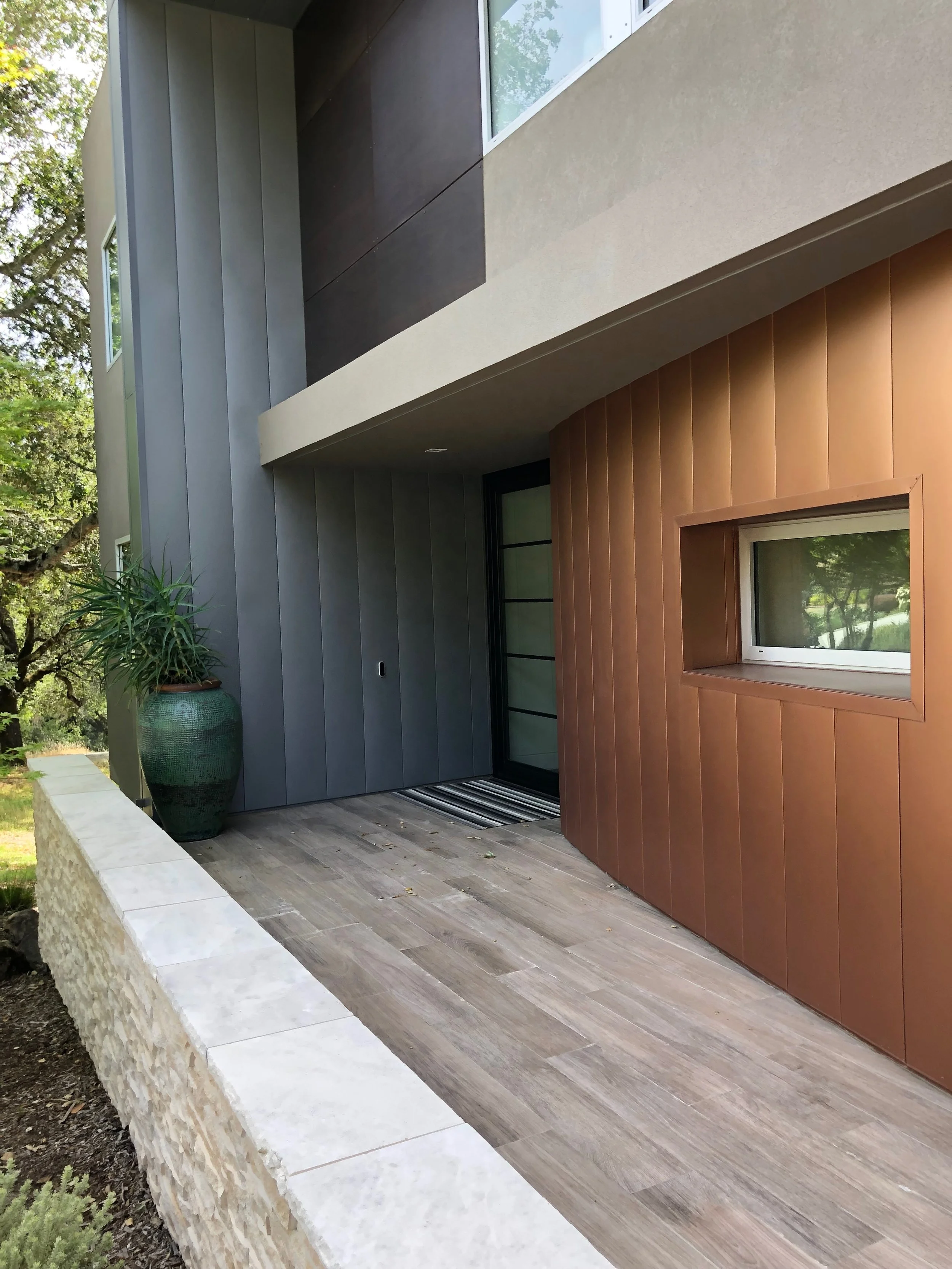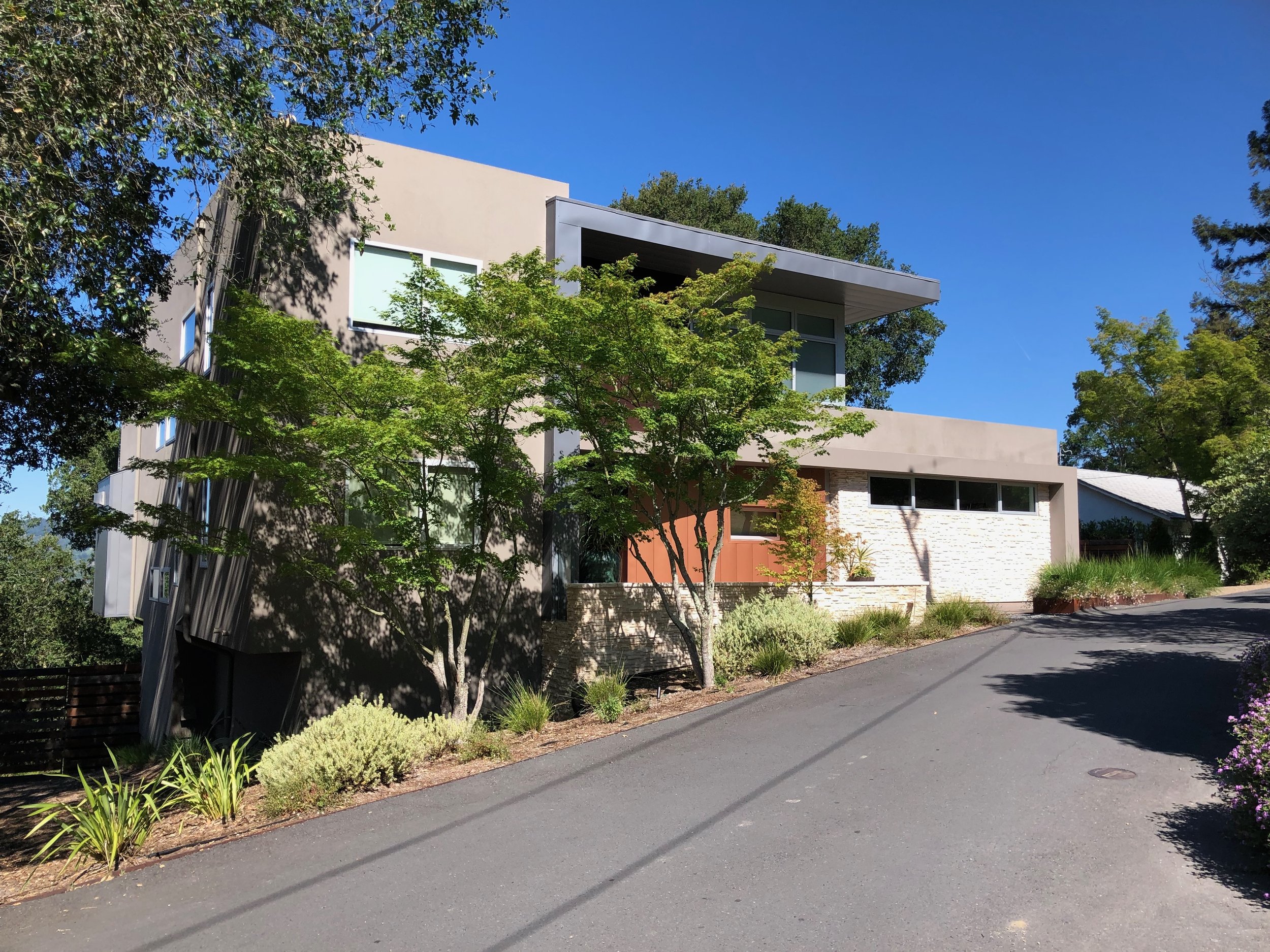 Referral on Wednesday, call from the prospective client on Thursday, meeting at the house with the real estate agent on Friday, house purchased on Tuesday and we were hired on Thursday! Our new client had one specific question - is it possible to transform this dog into a great house? With our emphatic "yes", our challenge was to flex our "design muscles" and prove to them what kind of great house could be created here. With virtual carte-blanche on the design, we removed the multiple peaked roofs of the former Alpine-style house to create a sophisticated mid-century modern home in the style of noted LA architect, Richard Neutra. The house was expanded to the rear with a two-story living room revealing the enormous south and west views, a new family room in the former 2-car garage, a curvy game room where the outdoor deck had been, a new master-suite on the 2nd floor that both captures the view, but also embraces the majestic live oak tree located just west of the house. Linking the floors is a modern 3-story staircase with floating wood treads and glass guardrails. Although snug up to the country lane on the front, the rear of the house has an expansive yard with equally expansive views. Decks on all three levels offer ample indoor-outdoor living spaces from intimate at the master bedroom sitting room to gracious at the comfortable patio at the yard level.